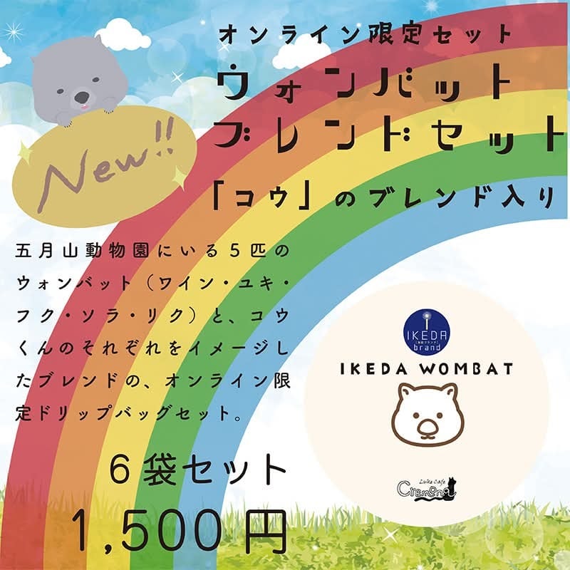 池田市にある「五月山動物園」にいる可愛いウォンバットたちをそれぞれイメージしてブレンドをつくりました。 ルークカフェ・クレモナのオリジナル商品です。 こちらのページ五月山動物園にいる5匹のウォンバットとコウくんも含めたドリップバック6袋のセットです。