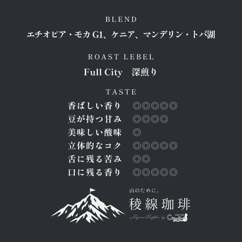 エチオピア・モカG1、ケニア、マンデリン・トバ湖を使った【稜線珈琲】オリジナルの深煎りブレンドです。